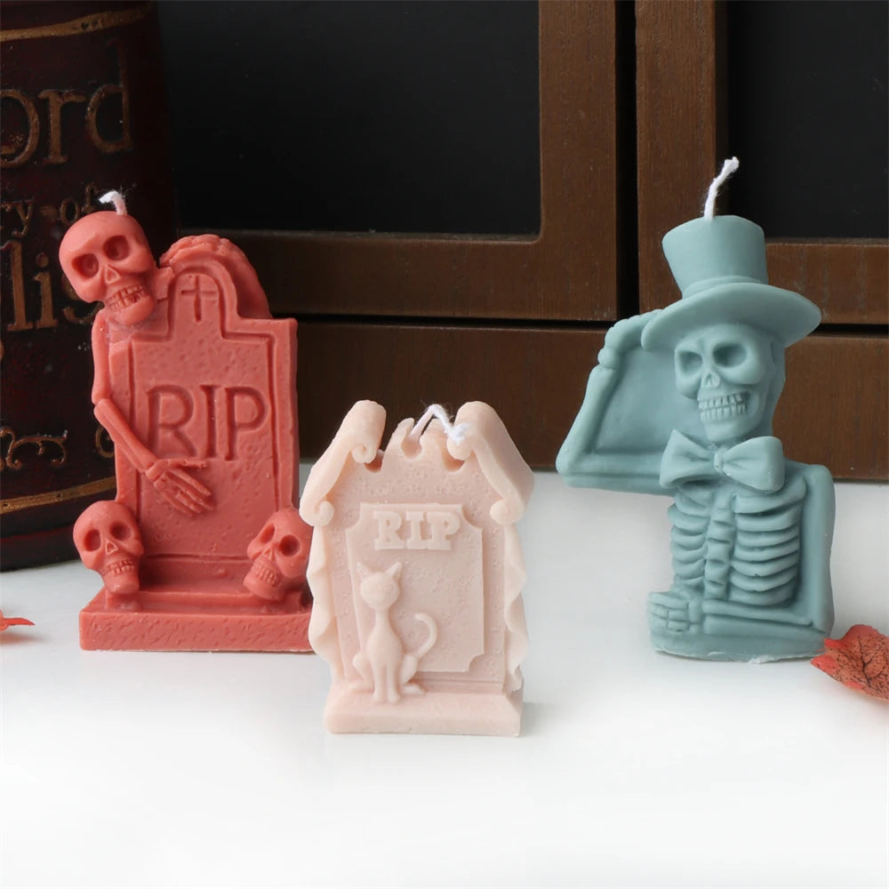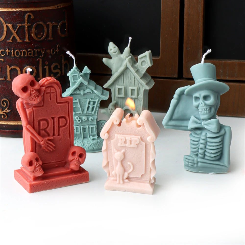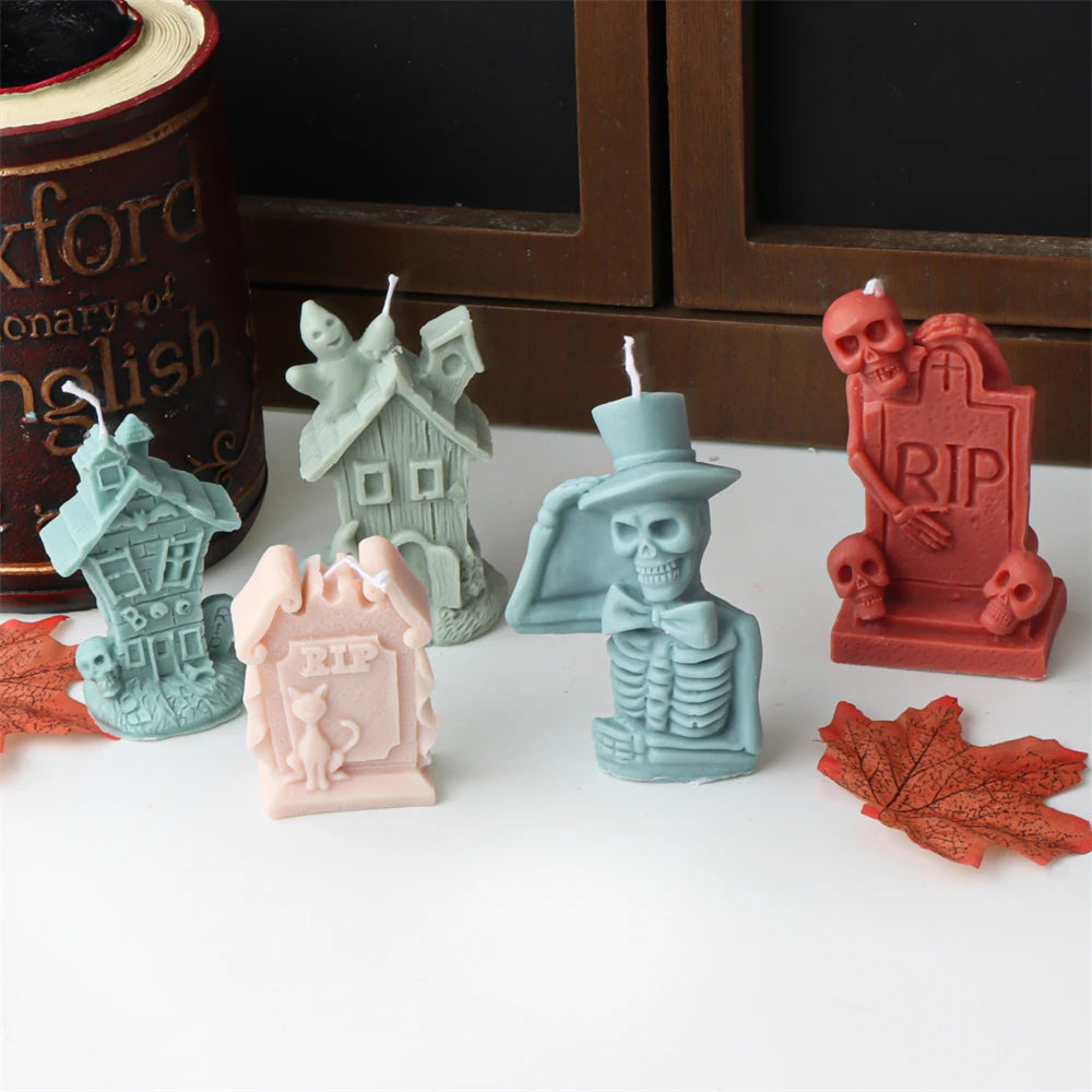 Halloween Skull Candle Mold 3D Haunted House Statues Resin Casting Craft Silicone Molds DIY Skull Tombstone Halloween Decor Mold