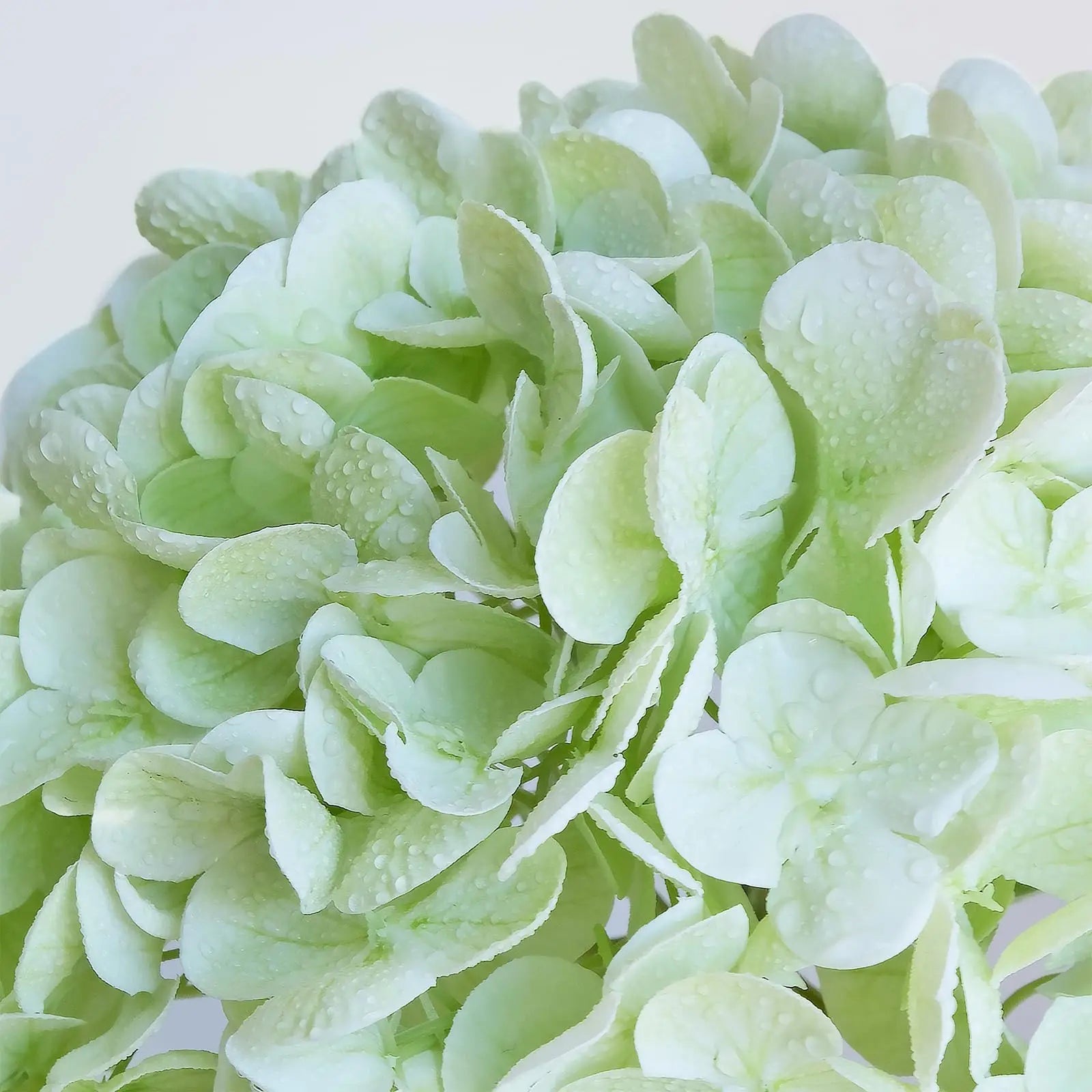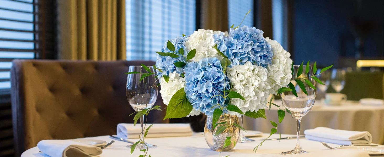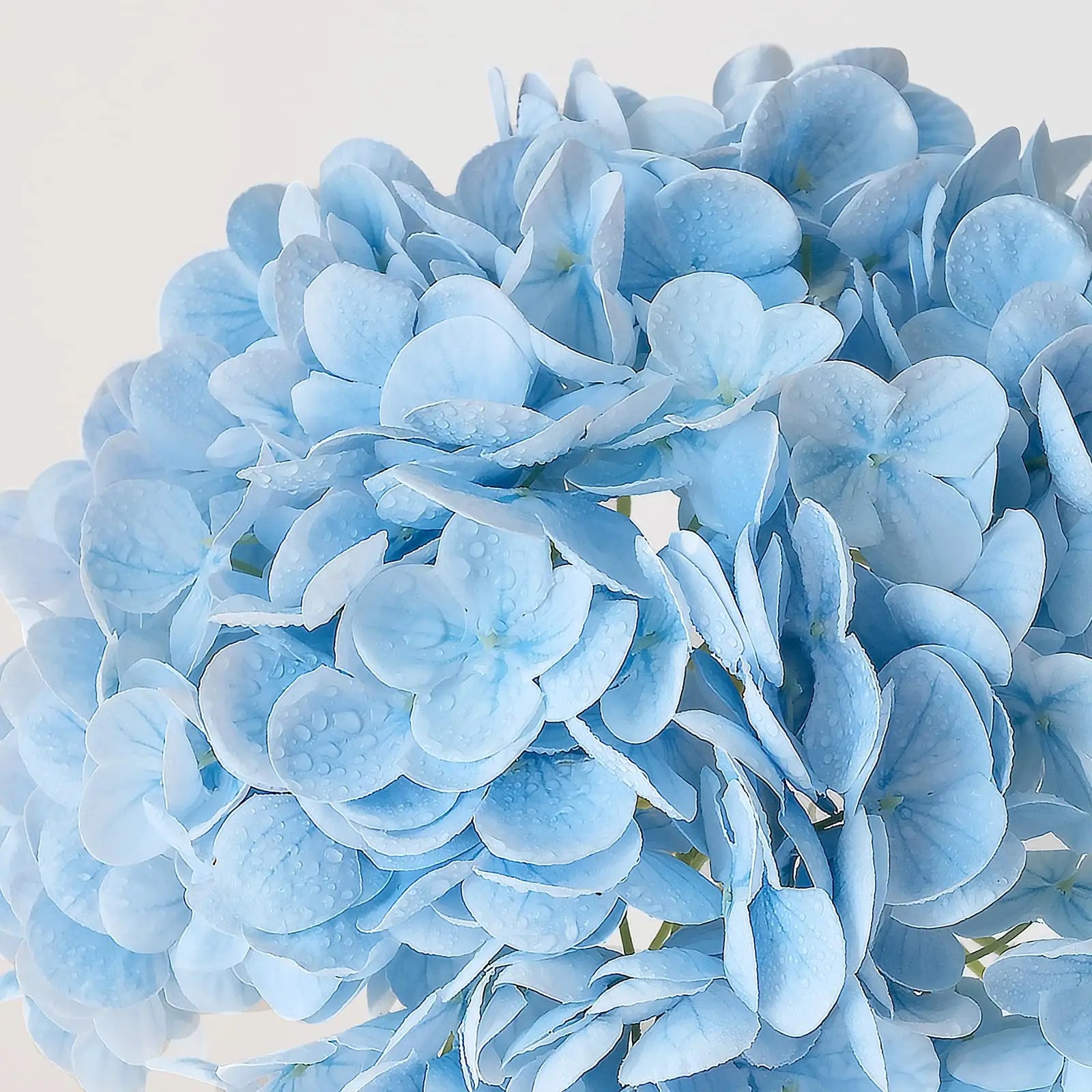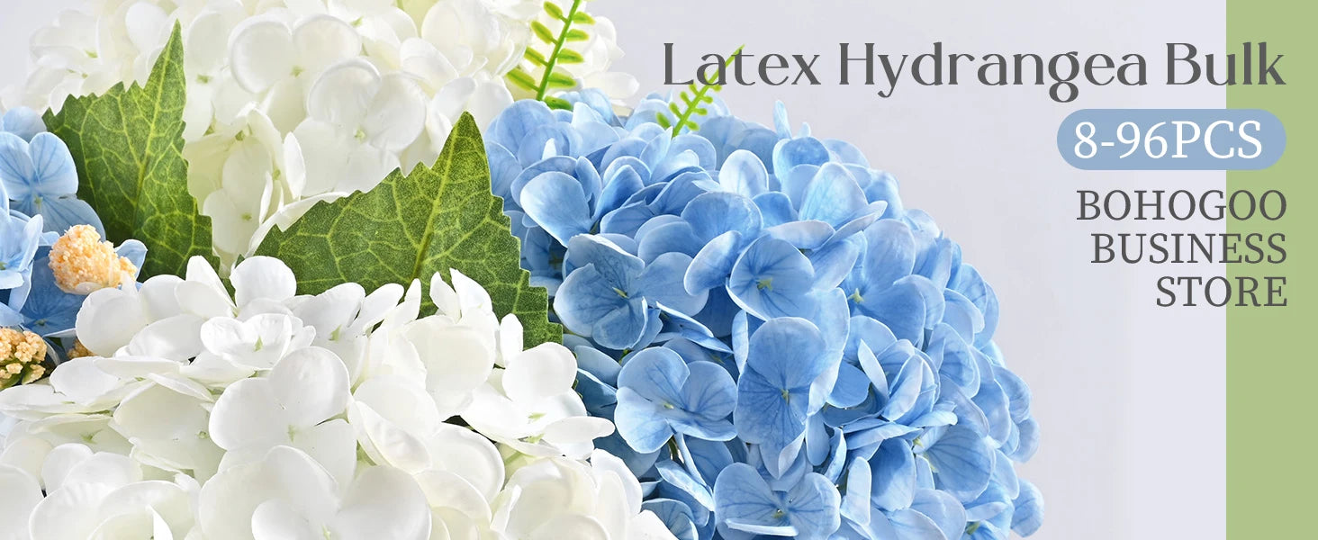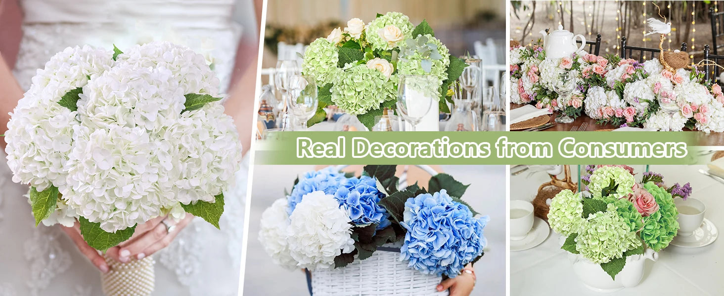 The Artificial Hydrangeas look like real, Flowers are made of soft and true touch latex,full and soft petals,No smell,safe for people and pets.More real, bigger and softer than ordinary hydrangea.After spraying water, the petals can condense water drops, can be placed outdoors, and resistant to fading.Note: The vase is NOT included!