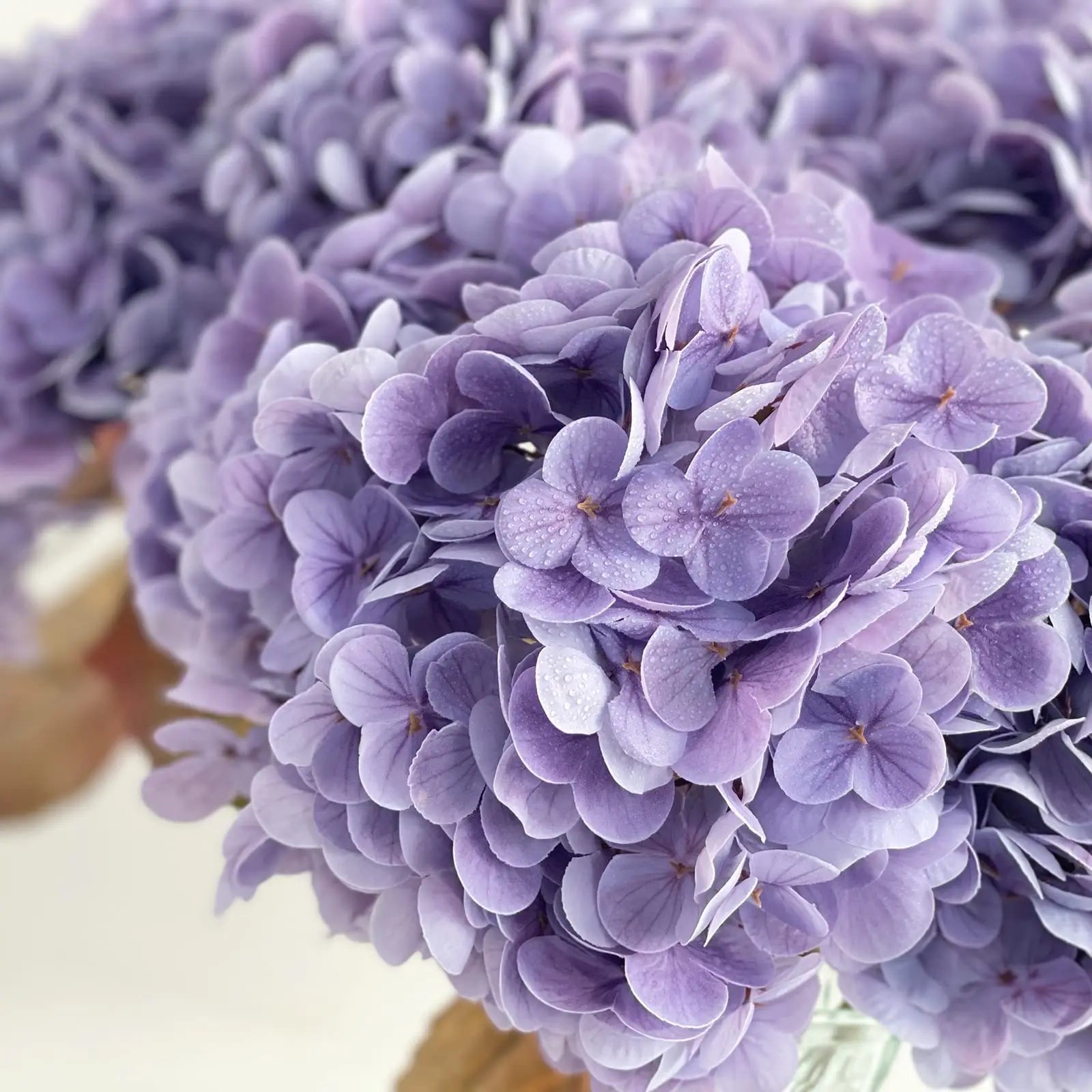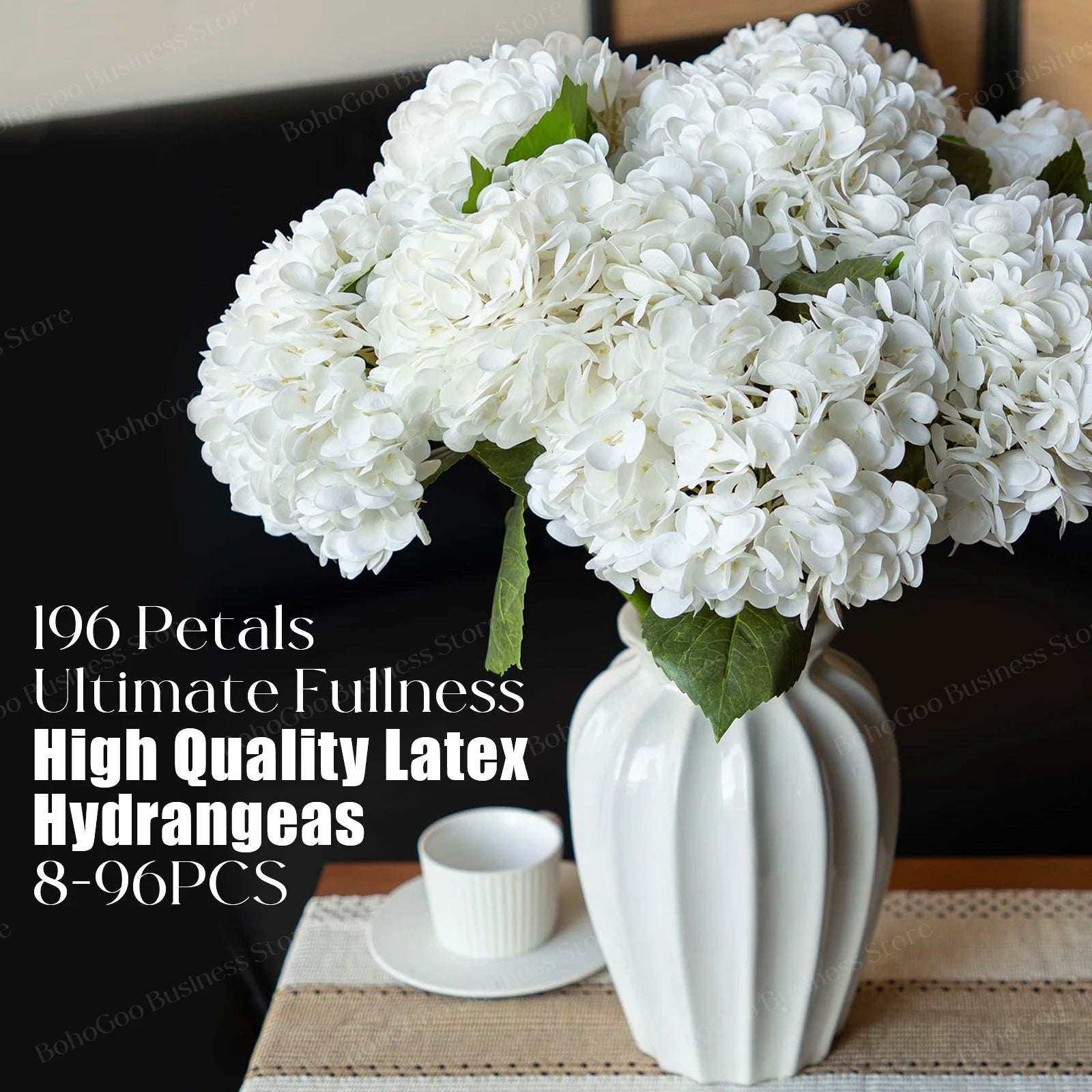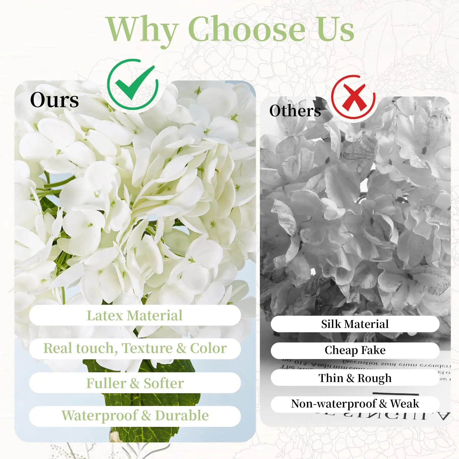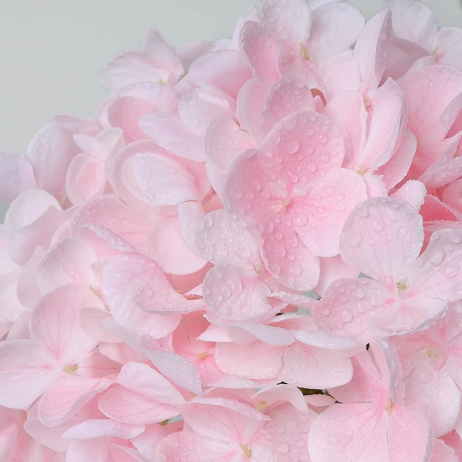 The Artificial Hydrangeas look like real, Flowers are made of soft and true touch latex,full and soft petals,No smell,safe for people and pets.More real, bigger and softer than ordinary hydrangea.After spraying water, the petals can condense water drops, can be placed outdoors, and resistant to fading.Note: The vase is NOT included!