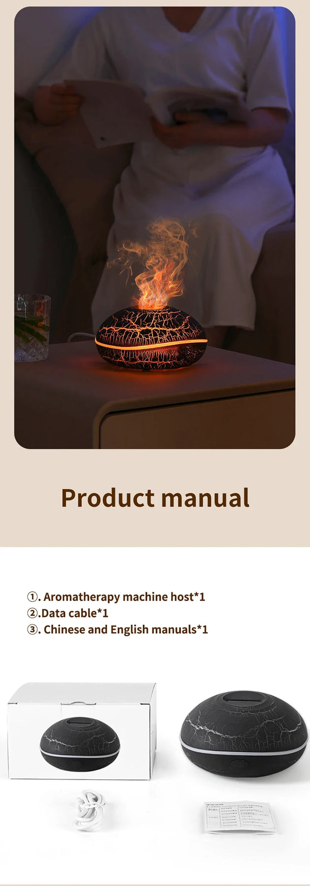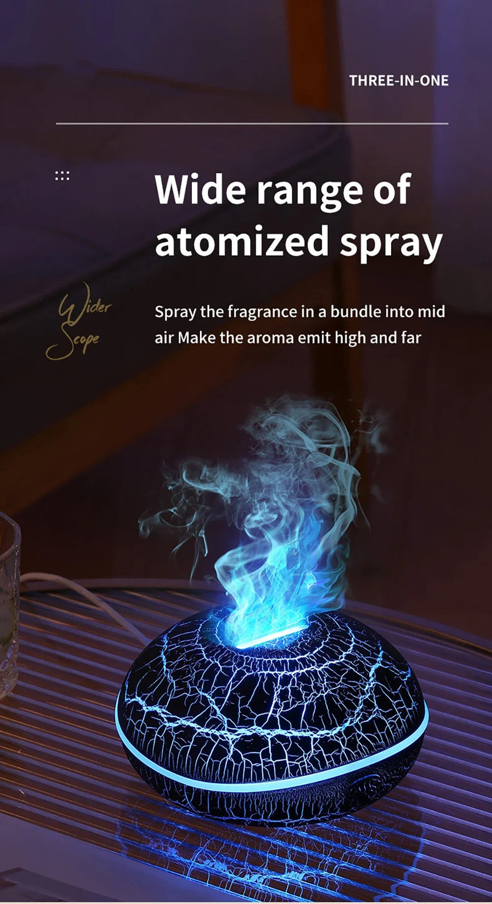 • Flame Effect Mist: Ultrasonic technology creates a mesmerizing flame-like vapor.