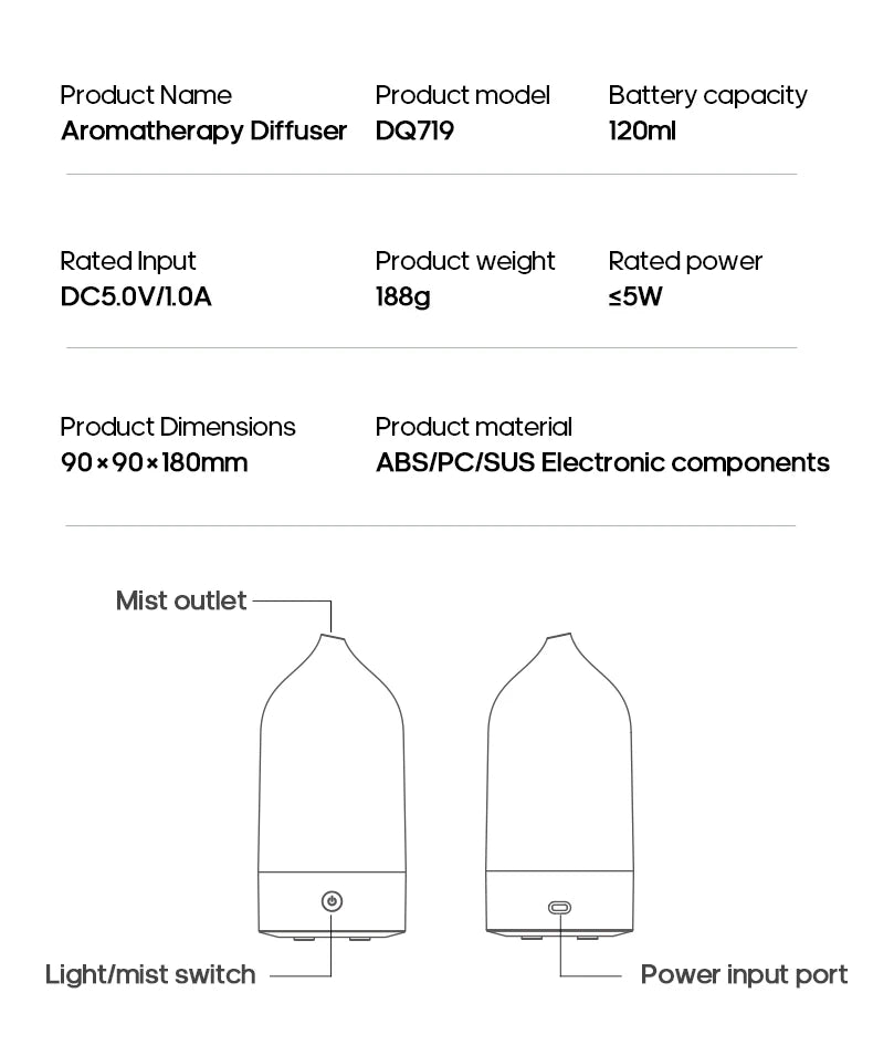 Powered by USB, this portable humidifier is lightweight and easy to carry, fitting seamlessly into small spaces or travel bags. The 120ml water tank provides up to 6 hours of continuous or intermittent mist, effectively combating dry air and improving air quality. Whisper-quiet ultrasonic technology ensures minimal noise, while the BPA-free materials guarantee safety and durability. Easy to use and clean, this diffuser is perfect for creating a spa-like atmosphere anywhere. Elevate your environment with this versatile aroma diffuser and enjoy a refreshing, fragrant space!