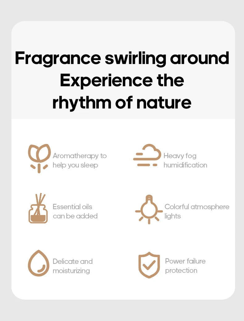 •Aromatherapy & Humidification: 120ml tank for essential oils and air moisture.