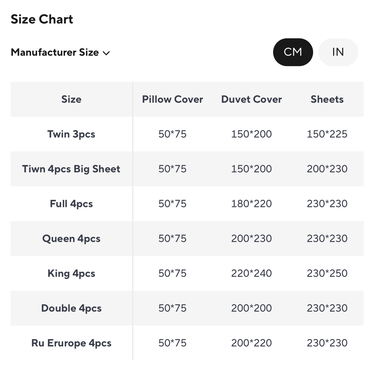Product Size Details: