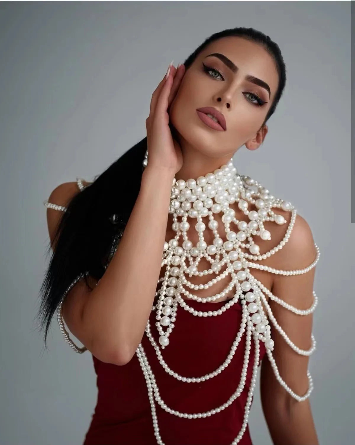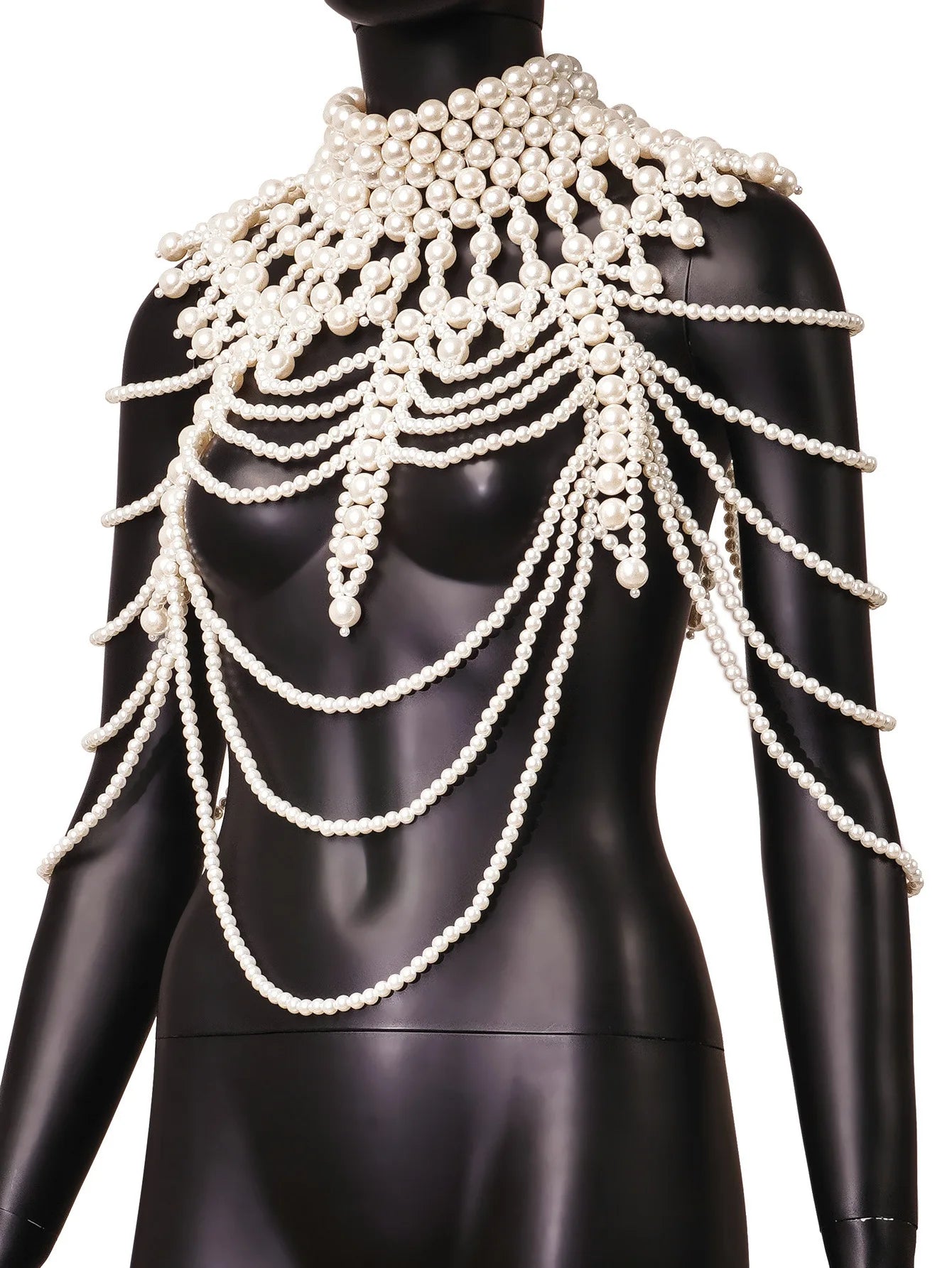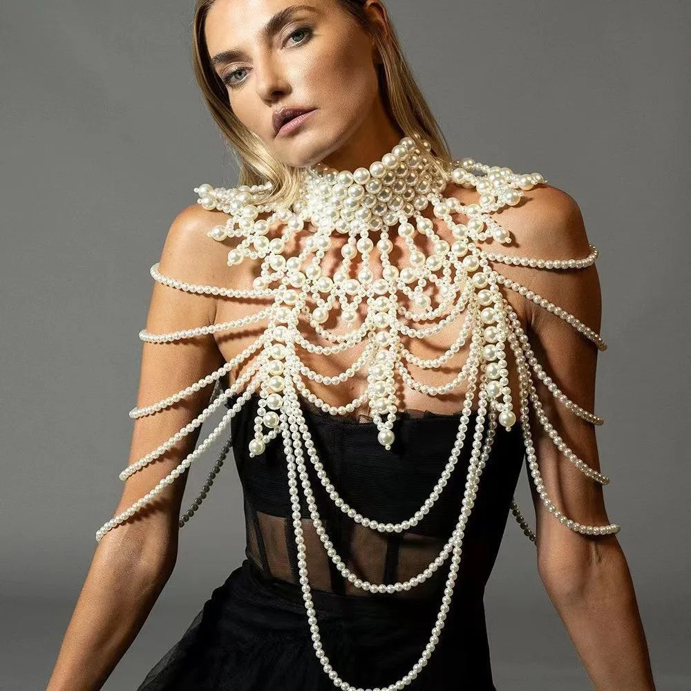 Make a bold statement with the Ladies Sexy Pearl Shawl Body Chain, a stunning piece of fashion jewelry that blends elegance and tribal allure. This layered body chain features intricate hollow woven designs adorned with lustrous pearls, creating a captivating tribal wind aesthetic. Perfect for women seeking to elevate their style at festivals, beach parties, or special events, this sexy body jewelry drapes beautifully over the shoulders, enhancing dresses, swimsuits, or boho-chic outfits.